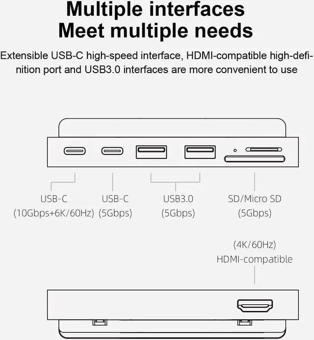 Multiple Interfaces: Hagibis USB-C dock with 4K@60Hz HDMI port, 10Gbps & 6K@60Hz USB C 3.1 Gen2 port, 5Gbps USB C port, 2 USB3.0 ports and 5Gbps SD/Micro SD Card Reader. *Note: SD/Micro SD Card can be read at the same time