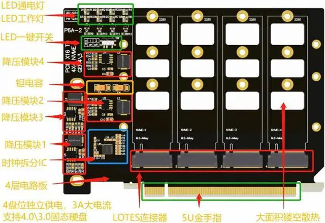 It is suitable for 1 to 4xM. 2 NVMe SSD memory card transfer to PCIe x16 interface expansion. Support PCI Express4.0x4x4x4x4, support 4 M.2 NVMe full-speed slots.