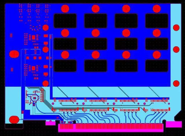 Gold finger immersion gold process, increase the gold thickness to 5U. 4xlotes M. 2 slots, large area hollow for heat dissipation. CLK clock split IC, 1 point 4 channels.