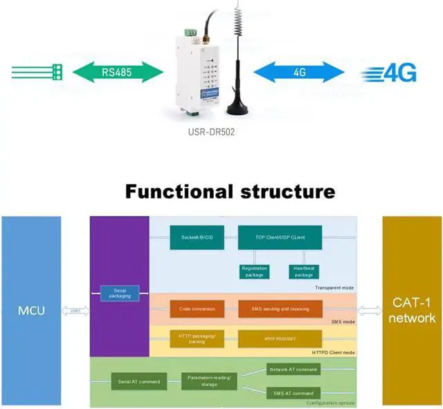 Basic Functions.Support the RS485 serial port, and easily deliver the data transparently between RS485 and 4G LTE Cat 1 network in bi-direction.