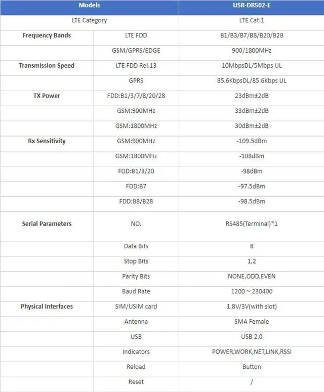 USR-DR502-E Wide Range Cost-Effective 4G LTE Cat 1 Modem Support RS485 Serial Port Sim Card Slot Built-in 35 mm DIN Rail Seat with MQTT/SSL (No Power Adapter,MQTT SSL Version)