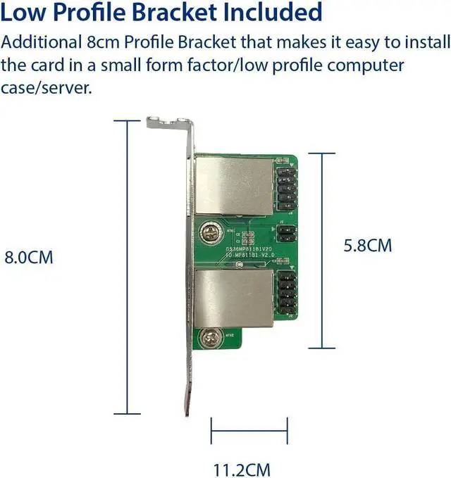 The high quality PCIe 2.5 Gigabit NIC with 12cm profile bracket and Additional 8cm Profile Bracket that makes it easy to install the card in a small form factor/low profile computer case/server.