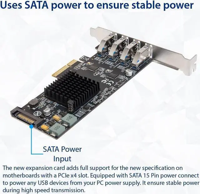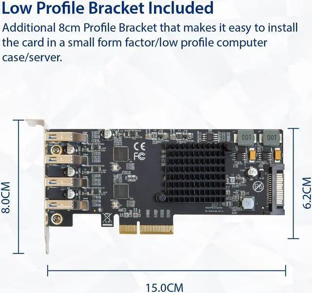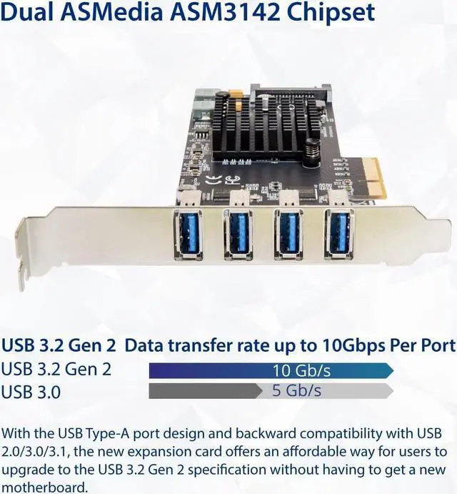 Add four USB 3.2 10Gbps ports to your system. Powered by dual ASMedia ASM3142 controllers to provide dedicated 10Gbps USB 3.2 transfer bandwidth for each port through PCIe 3.0 x4 host interface.