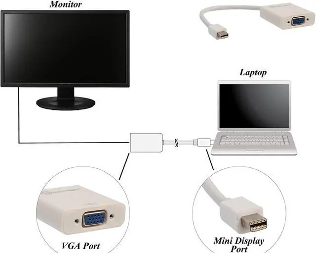 Compatible with DisplayPort 1.1 and 1.2 specifications Supports VGA output resolutions up to 1920x1200 Allows you to connect to a VGA Display for a larger work area. Adapter is 9.25 in length (cable length is 5.8 in) Mini DisplayPort to VGA Female