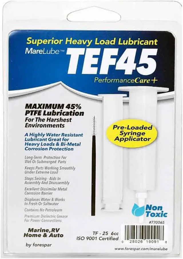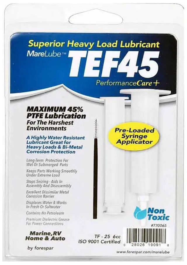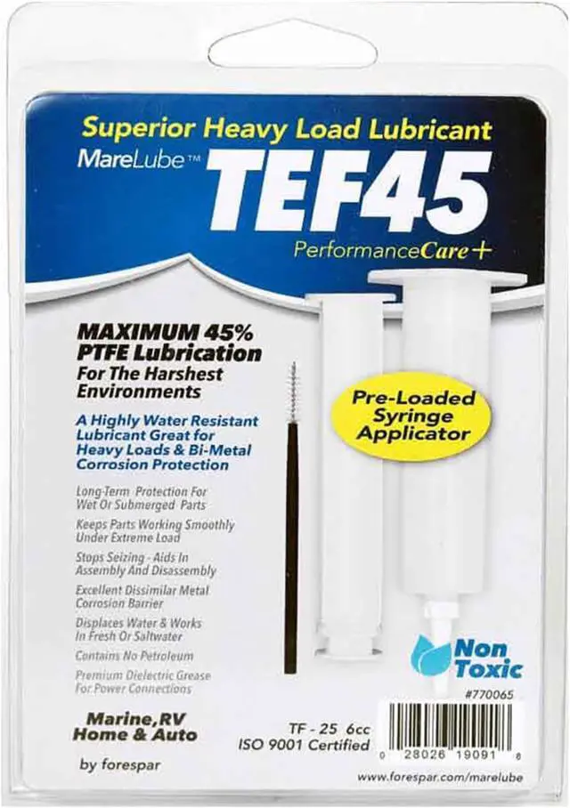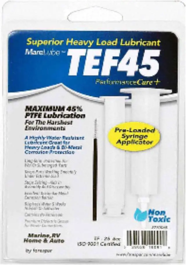 Marelube TEF45 6cc SyringeA highly water-resistant synthetic lubricant grease containing 45% PTFE, the highest PTFE available. Perfect for heavy loads and bi-metal anti-corrosion applications. Also works well at protecting against rust corrosion and anti-seize applications. - cis2:mm5lnZ1k -