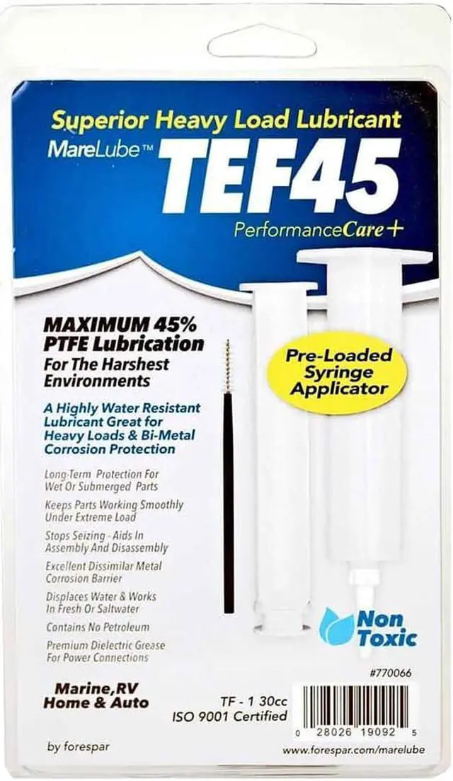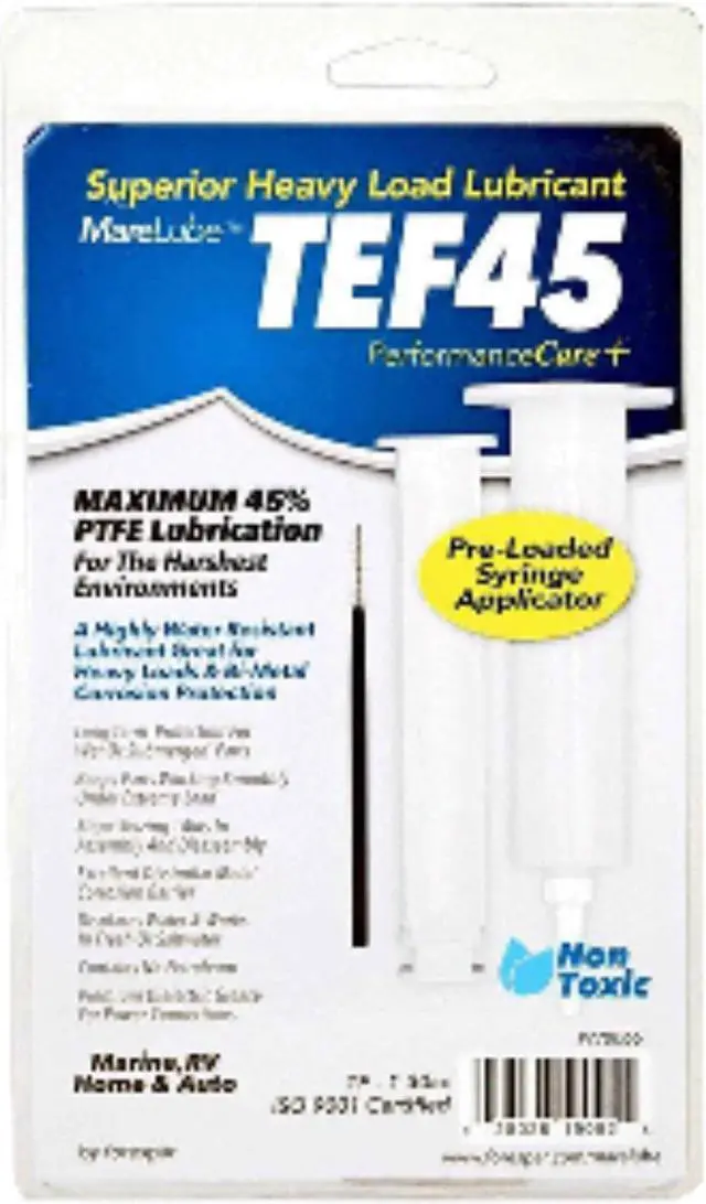 Marelube TEF45 30cc SyringeA highly water-resistant synthetic lubricant grease containing 45% PTFE, the highest PTFE available. Perfect for heavy loads and bi-metal anti-corrosion applications. Also works well at protecting against rust corrosion and anti-seize applications. - cis2:mm5lnZ1k -