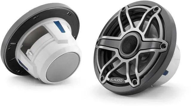 Sport Grille Model: M6-650X-S-GmTi M6 6.5 -inch Marine Coaxial Speakers (75 W, 4 ohms) - Gray Metallic Trim Ring, Titanium Sport Grille Purpose-engineered and built for real marine duty, M6 coaxial systems deliver maximum audio performance in any open-air boating environment. A DMA-optimized, long excursion woofer design and excellent power handling ensures your music will come through loud and clear at speed, or at anchor. A 0.8 -inch pure silk dome tweeter, specially treated to withstand the marine environment, handles the high-frequency duties. You will appreciate the clean, articulate high-frequency response of the M6 dome tweeter, especially at higher volume levels. A multi-order, true 2-way passive crossover is concealed within the woofer chassis, shielded from vibration and corrosion. Also included, is an automatic, solid-state tweeter protection circuit to minimize the possibility of tweeter failure. Although M6-650-X Coaxial Systems can be used with as little as 25 W per channel, for best audio performance we recommend amplifiers capable of between 75-150 W of continuous power per channel. Production of all M6 loudspeakers takes place in JL Audio’ s Miramar, Florida factory, using global components and materials Sold as a pair.