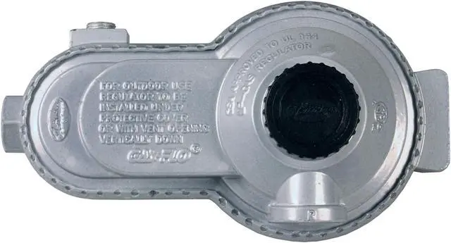 JR Products' 07-30385 Low Pressure Two-Stage LP Gas Regulator combines both a high pressure first stage and a low pressure second stage regulator into one unit. Ideally designed for RV applications, these regulators ensure a smooth and continuous flow of gas to all appliances. It offers a 9:00 vent position, 1/4" FPT inlet, 3/8" FPT outlet, 225,000 BTU/Hr capacity, zinc die-cast construction with molded rubber diaphragms, and an adjustable screw and dust cap design. UL Approved.