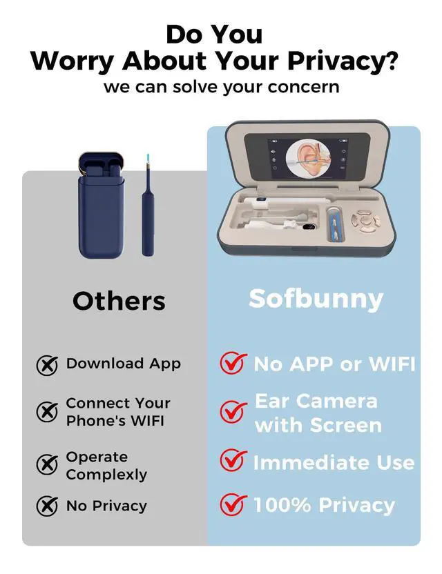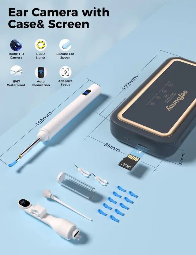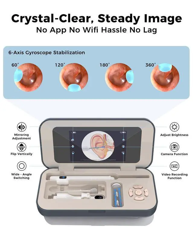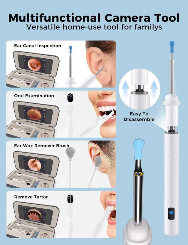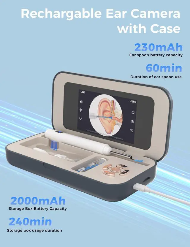 NOTES: 1. Please put the silicone sleeve tightly on the ear pick before use. 2. Do not break the ear pick with your hands. 3. Children should be supervised by an adult when using the Visual Ear Endoscope. 4. It is not recommended for children under 6 years old and pets on the move. 5. Keep it out of the reach of children as much as possible. 6. For first-time users, please approach the ear canal gently and slowly. 7. Please follow the user manual for your first use. 8. Please do not use metal ear picks directly to cleaner earwax. 9. Please use a regular 5V1A charging plug to charge the product. 10. Do not use the product while charging. 11. Please do not put the product near the fire source under any circumstances. 12. Do not charge the product continuously for more than 1.5 hours.