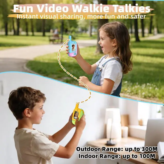 Long distance transmission and secure connectionOur kids video walkie talkies use one-on-one exclusive secure pairing technology. Indoor communication coverage can reach up to 100 meters, and outdoor communication can extend as far as 300 meters, providing parents with a reliable and secure private chat experience.