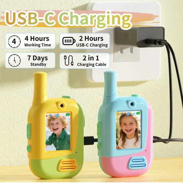 Rechargeable and easy for children to useThis rechargeable walkie talkies for kids comes with a charging function, completely eliminating the hassle of frequent battery changes! Type-C 2-in-1 charging design, fast charging, long-term use, tailored for boys and girls, kids toys, easy to operate, compact and lightweight body, more ergonomic, perfect for children's hands, making outdoor games more fun and interactive.