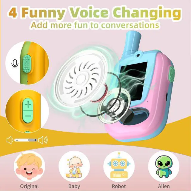 Hilarious Voice Changer ModesOur children's walkie talkie has 4 sound effects (original, child, robot, alien). Short press the "M" key to switch between the 4 voice modes, which can stimulate children's creativity - perfect for role-playing, silly games, and turn every conversation into a fun little show.