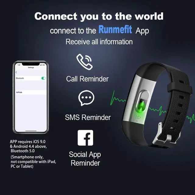 This activity tracker requires iOS 9.0 & Android 4.4 above, Bluetooth 5.0 (Smartphone only, not compatible with iPad, PC or Tablet)