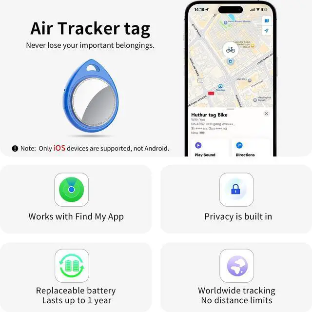 Works with Apple Find My App This smart tracker offers multiple features, including proximity sound alerts, navigation tracking, left-behind reminders, Lost Mode, and sharing location with up to 5 contacts. (This product is compatible only with iOS devices and does not support Android.)