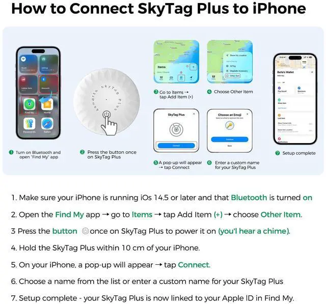 | How to connect with iPhone? | Make sure your iPhone or iPad is running iOS 14.5 or later, and confirm Bluetooth is turned on. Open the Find My app ? go to Items ? tap Add Item ? choose Other Item. Then, power on the SkyTag Plus with a short button press and hold it close to your iPhone, within about 10 cm. When it appears on screen, tap Connect, assign a name, and finish setup. |