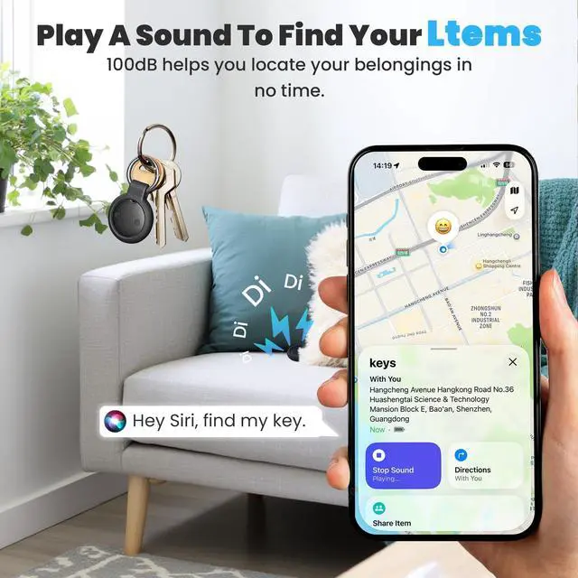 Precision Finding with Loud 100dB AlarmOpen the app to see the real-time distance to your lost item (up to 165ft/50m Bluetooth range). Tap "Play Sound" and the built-in speaker emits a piercing 100-decibel ring. Loud enough to hear from deep inside a couch, a cluttered drawer, or under a car seat. You can also use Siri for hands-free locating.