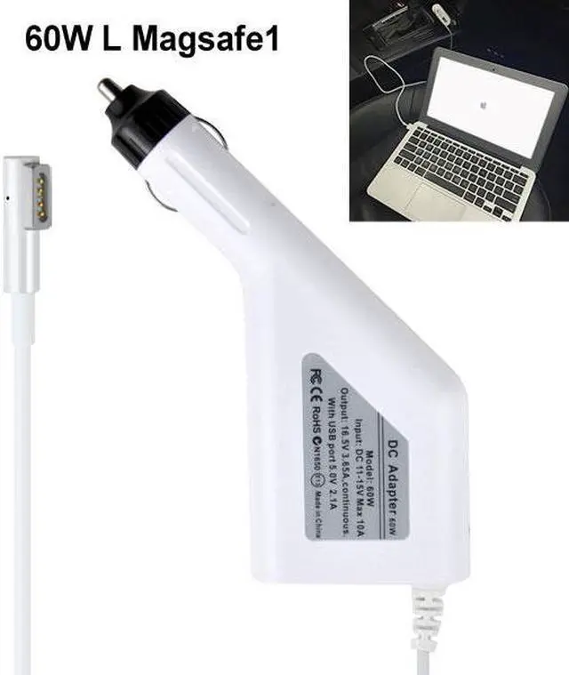 60W Magsafe1 L Connect Car Charger Power Supply Cord Plug For MacBook With Extra USB Slot To Charge iPad iPhone Cell Phones - White Brand new,elegant and reliable car charger for MacBook.L-Shaped magsafe connectors compatible with pre-2012 MacBook product lines ,not for magsafe 2.Provides steady, high speed and adequate power for your MacBook on the go.With this car charger, Macbook users can conveniently charge your MacBook device by plugging into a vehicle DC or cigarette outlet.