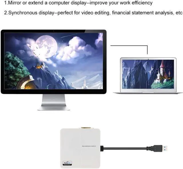 USB 3.0 provide super fast speed from PC to video and Ethernet, backward compatible with USB 2.0 / 1.0. Two Graphics PortsA HDMI and a DVI port with VGA adapter (included) for connecting two external monitors equip with extend mode/mirror mode and support for resolutions up to 2560 * 1440 (HDMI only) and 1920 * 1200 (DVI or VGA). Gigabit EthernetA RJ-45 Gigabit Ethernet network port supports transmission speed up to 1000Mbps. High Performance