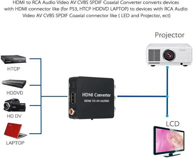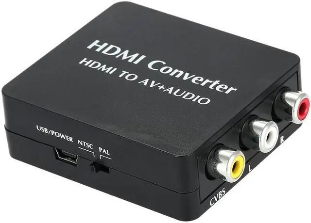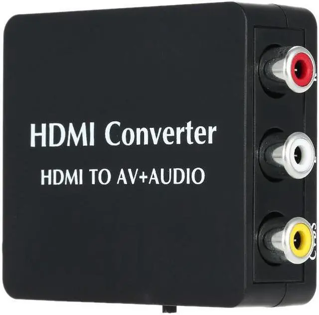 The mini HDMI to AV signal converter which will convert HD video signal or audio signal to AV (CVBS) compposite video signal and the FL / FR stereo audio signals, while support DVI system sideline signals. To help users convert the high quality of the HDMI video signal into normal CVBS signal(standard-definition 480i,576i,). So that it can play on TV, VHS VCR, DVD recorders, etc and support NTSC and PAL two TV format.Features:No need to install drivers, portable, flexible, plug and play.Low power.Support NTSC and PAL two standard TV formats output.Compliant with HDMI 1.3.Support SPDIF and Coaxial audio outputs. Specifications:Type: HDMI ConverterSignal Inputs: HDMI inputOutput Vedio: Composite Signal (Yellow, White, Red)CVBS Output: PAL, NTSCHDMI Input Resolution: 640 * 480@60Hz, 800 * 600@60Hz, 1024 * 768@60Hz, 1280 * 720@60Hz, 1280 * 1024@60Hz, 1360 * 768@60Hz, 1920 * 1080@60Hz, 480i / 60Hz, 480p / 60Hz, 576i / 60Hz, 576p / 60Hz, 720p 50 / 60Hz, 1080i 50 / 60Hz, 1080p 50 / 60Hz.Item Size: Approx. 7 * 5.3 * 2cm / 2.76 * 2.09 * 0.79in Item Weight: Approx.40g / 1.43ozPackage Size: Approx.15.5 * 9.1 * 2.5cm / 6.10 * 3.58 * 0.98inPackage Weight: Approx. 80g / 2.86oz