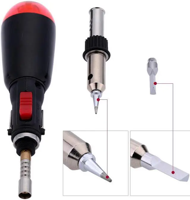 Specifications:Color: Red + Black + SilverMaterial: Plastic + MetalFuel: Pure ButaneFilling Capacity: 12mlFlame Temperature: 1300CIron Temperature: 450CWorking Time: 50-80 MinutesDimensions: 20 * 2cm / 7.87 * 0.79in (L * Dia.)Package Size: 17 * 9 * 3cm / 6.7 * 3.54 * 1.18inPackage Weight: 81g / 2.88ozNote:The product is not filled with gas yet, please refill it before use. Features:Pen style design is unique, generous and elegant.High capacity and excellent performance.Easy for ignition, quick heat and durable use. Compact size, lightweight and portable to carry.Use gas as its power without voltage and wire limitation. Can be used as ordinary soldering iron, heat gun or flame gun, very practical.It is equipped with multi-layer for anti-oxidation and a round soldering iron tip for anti-corrosion.Touch the tip of the tool to the spot where the two materials will join to heat the area It is ideal for your electronics work.