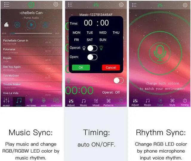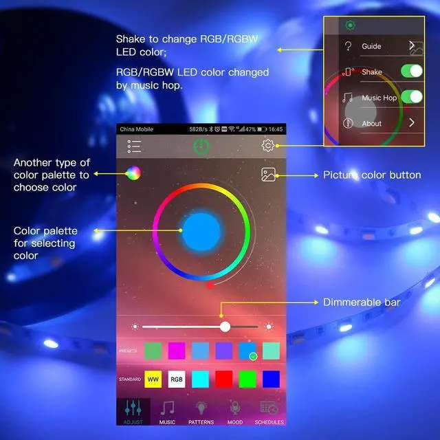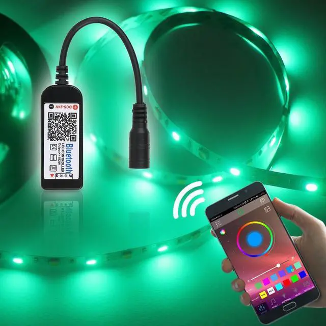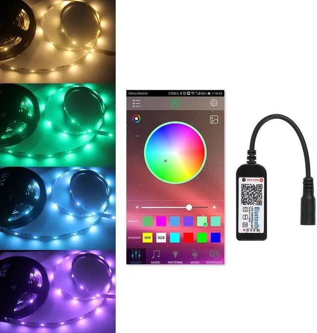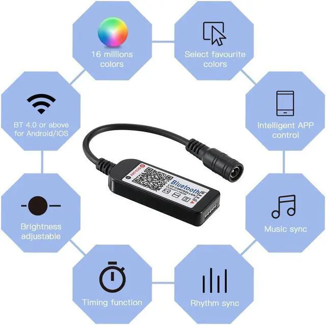 Specifications: Input voltage: DC 5-22v Output wattage: Max.192w Input electric current: Max. 8a Connection Method: Bluetooth Version 4.0 or above for Android or for IOS Output: 4 channels (RGB)/5 channels (RGBW) Effective Remote Distance: No barrier, within 30m / 98.4ft Item color: Black Material: PVC Item size: 5.8 * 2.3 * 0.9cm / 2.3 * 0.9 * 0.4in (L * W * H) Item weight: 15g / 0.5oz Package size: 13 * 9 * 1cm / 5.1 * 3.5 * 0.4in (L * W * H) Package weight: 17g / 0.6oz Note: This product is non-waterproof, please use it carefully. This mini RGBW/RGB Bluetooth controller is easy to use and carry for its small size and light weight. You just download the APP freely from website so that you can let your life become vivid and colorful . It is perfect for LED color lighting product, like LED strip light, LED lighting box etc. Wish you have infinite joy from the combination of light and music. Features: 100% brand new and superb quality. Be suitable for all RGB/RGBW LED lighting products, wide application. Download APP freely from website, APP control, easy to operate and APP updates automatically, customers use without worry. Universal interface, just plug and play. Designed to link bluetooth version 4.0 or above for Android or for IOS to use, flexible and thoughtful. 16 millions color changings, timing function, memory function, brightness adjustable, scene settings, music sync, rhythm sync, hand-shook color/music changing, all the above functions are all realized by this small controller, practical and reliable. It can control 6 LED fixtures at most at the same time, user-friendly. Mini size and light weight ensure that you can carry it easily