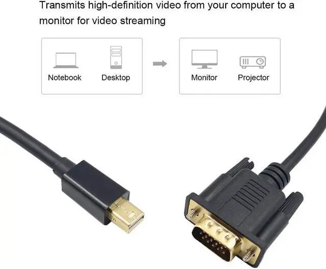 Specifications: Material: ABS Type: Mini DP to VGA Cable Connector A: Mini DP Connector B: VGA Application: for Projector DTV TV HDVD Player Color: Black Length: 1.8m Item Weight: Approx. 75.4g / 2.65oz Package Size: Approx. 11cm * 9cm * 1.5cm / 4.3in * 3.5in * 0.6in Package Weight: Approx. 77g / 2.71oz Features: Mini DP to VGA: Connects a mini displayPort (Thunderbolt port compatible computer ) equipped computer to display with VGA input port. Resolution: Supports up to 1080p, 1920 x 1200 reduced blanking video resolution, EDID pass-through from PC source to display. Durable: Low-profile connector does not block adjacent ports on your computer, has molded strain-relief for long life. Secure: Mini displayPort connector with latches provides a secure connection with a release button that must be depressed before unplugging. Reliable: Gold-plated connectors, tinned copper conductors, foil and braid shielding combine together to provide reliable connectivity.
