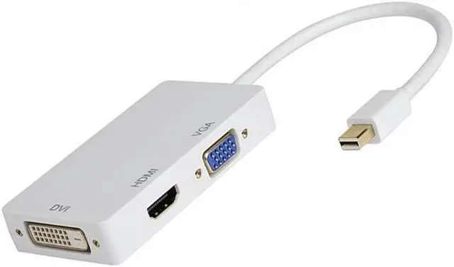 Dayspirit Mini DP DisplayPort Male to VGA HDMI DVI Adapter Converter Product Features:Support HDMI, DVI or VGA input port. You can connect the display to one of HDMI/DVI/VGA output ports (Only one of the 3 outputs could be used at a time, you can not use all of them simultaneously). Compatible: The adapter support HDMI, DVI or VGA input port, seamlessly connect Mac Book, Mac Book Pro or Mac Book Air with a Mini display port to high definition displays. Three different ports meet your different needs. Supports plug and play, and no external power needed. Compact and lightweight and portable: Space-saving design fits easily in your laptop carrying bag. HDMI/DVI/VGA output with the max resolution of 1920x1080p @60Hz, 225MHz/2.25Gbps per channel (6.75Gbps all channel), 12bit per channel (36bit all channel) deep color. Notice (This is very important): 1. You should assure that if your Mac has one of the following two kinds of port : Mini DisplayPort and Thunderbolt port. 2. Only one of the 3 outputs could be used at a time, you can not use all of them simultaneously. 3. For some compatible devices, it might take a few seconds for the video to display. 4. DO NOT connect other adapter/converter to this adapter for a second signal convert, we can't guarantee it works well. 5. No audio output via VGA! When connecting VGA display alone, please connect an audio cable for audio transmission. 6. Can only convert signal from Mini DisplayPort to HDMI/VGA/DVI. This is not a bi-directional cable. How to use it:This product with three output ports, and you can choose one of them to use at a time as you demand, the functions of the port as followings:DVI output, connect the DVI devices using a DVI cable.HDMI output, connect the HDMI devices using a HDMI cable.VGA output, connect the VGA devices using a VGA cable.The Mini Display Port needs to connect MacBook, MacBook Pro, or MacBook Air.