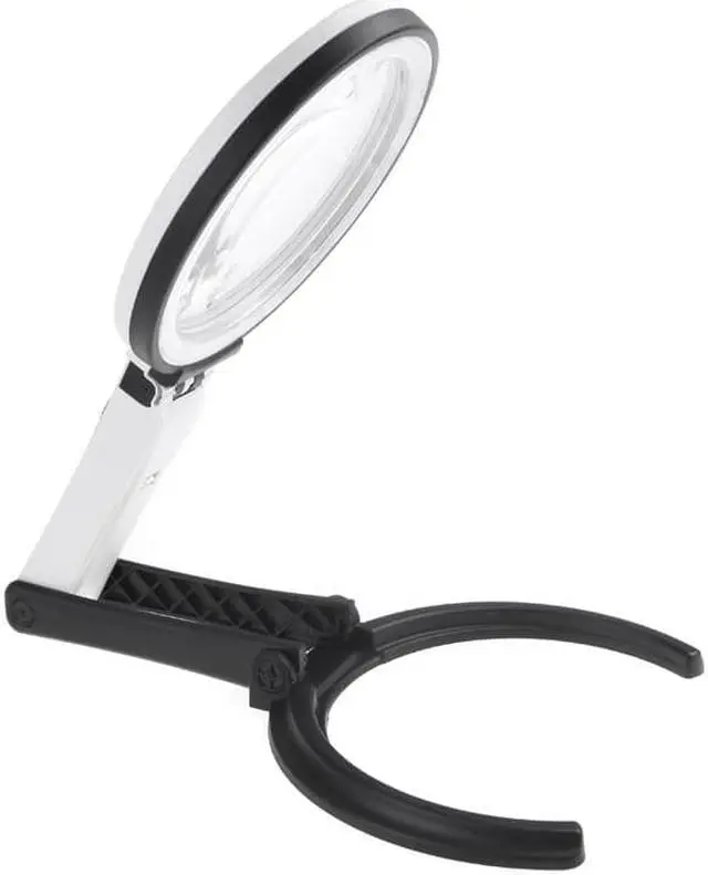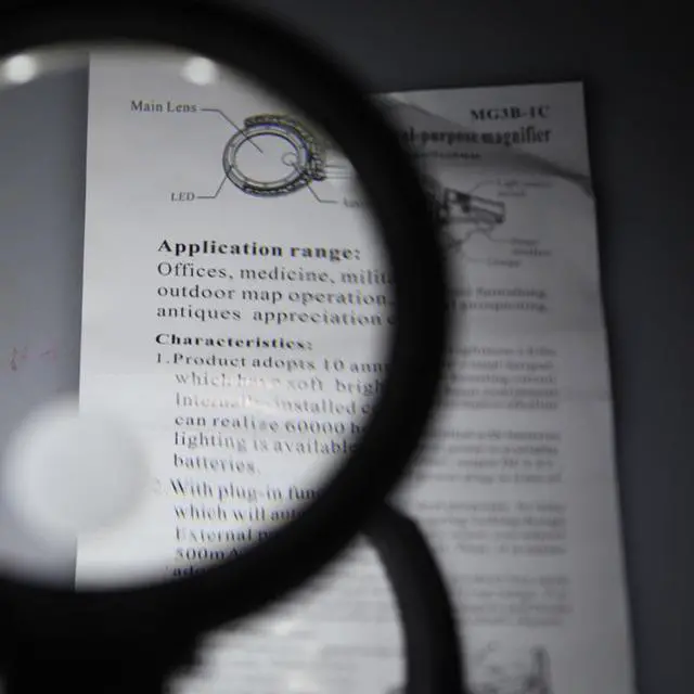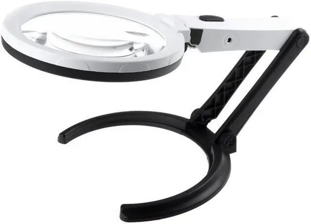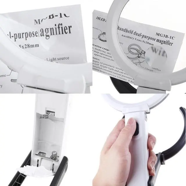 Specifications: Main(large) lens: Approx. 2 * 120mm, auxiliary lens: 5 * 28mm LED qty: 10 Battery: 2 * AA batteries (not included) External power supply: Input AC 100-250V, 50/60Hz; Output: DC4.8V, 500mA Product size: Approx. 28 * 17.2cm / 11.0 * 6.8in(Folded) Product weight: Approx. 275g / 9.67oz Package size: Approx. 28.5 * 18.5 * 3cm / 11.2 * 7.3 * 1.2in Package weight: Approx. 399g / 14.09oz Features: Adopts 10 annularly arranged high brightness LEDs which have soft bright light and can alleviate visual fatigue. Internally-installed constant current pressure-boosting circuit can realize 60000 hours service lifetime. 8-hour continuous lighting is available due to two AA high performance alkaline batteries. Internally installed with batteries(NOT included) which will automatically shut off when external power is available. External power: Input AC 100-250V, 50/60Hz; Output: DC4.8V, 500mA. It is required to unplug external power plug in time of adopting batteries lighting. Foldable to stand up on desk or to be handheld. In time of using desk-type function, you can adjust the lighting comfort level, very easy and convenient to use. Widely used in offices, medicine, military affairs, reading, home furnishing, outdoor map operation, archaeology, mineral prospecting, antiques appreciation, etc.