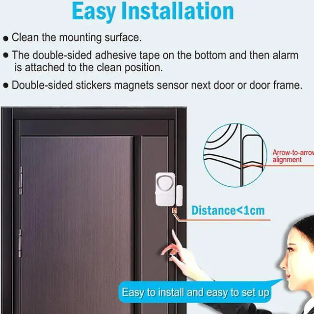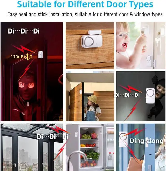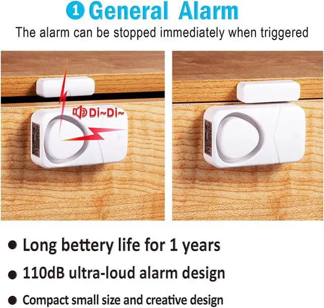 • Features:*110 decibel loud alarm goes off when door or window opens and it will not stop even the door closed, effectively helps deter intruder and alert residence. The wireless window sensors will give you peace of mind.*4-in-1 Mode: 1. General alarm (alarm stop if door closed); 2. Constant Alarm (constant alarm even door closed); 3. Closing-door Alert (sound Di..Di from 0dB to 110dB); 4. Door Open Chime (sounds DingDong once if door opens), can be used as a doorbell. Super easy to set the mode according to your need.*Come with LR44 batteries for each alarm sensor. Low battery consumption, battery can last up to one year. And it have low battery indicator, indicator light blink once every second and DuDu sounds every half hour to remind you to replace battery.*Light-weight and small alarm ideal intrusion warning for kinds of doors and windows (sliding doors/windows, hung doors/windows, crank doors/windows), cabinets, drawers,