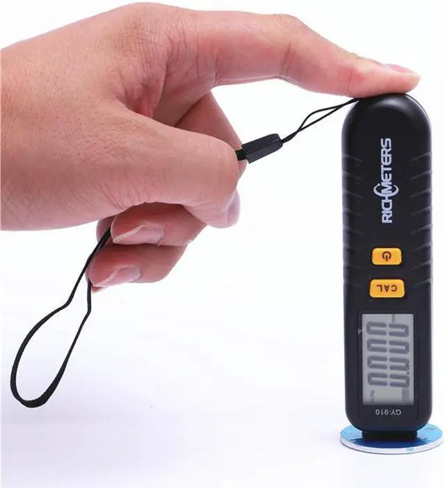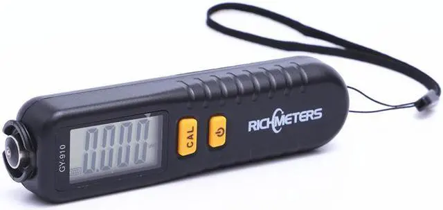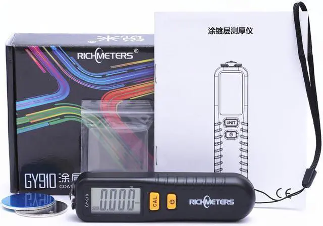 Test GY910 Digital Coating Thickness Gauge Calibration stepClick CAL 4 times to enter NFE modeClick CAL 6 times to enter Fe modeWhen the display reads 0, put the probe on the plate. When the display reads 50, put 50 um film on the plate and click the POWER button to test. Repeat these steps for 100, 250, 500 and 1250. When the display reads AIR, switch the probe into AIR mode, then click the POWER button to calibrate - do not place the probe on the plate.