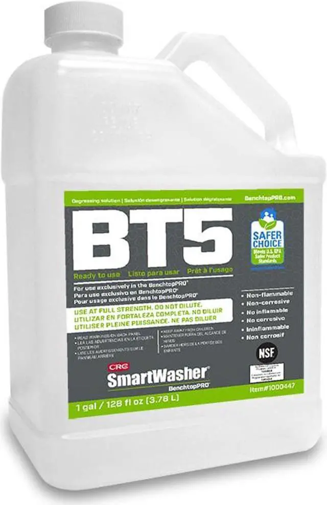 The SmartWasher BT5 Ready-to-Use Degreasing Solution is designed for use exclusively in the BenchtopPRO Bioremediating Parts Washer. Use at full strength. Do not dilute. The formula is non-corrosive and non-flammable.