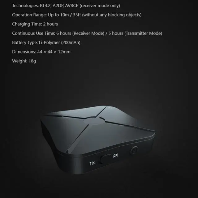 Receiver mode: wirelessly transmit audio from a Bluetooth-enabled mobile phone, tablet or computer to wired stereo speakers or headphones Just tap the switch to switch between transmitter and receiver modes. Easy connection using advanced Bluetooth technology and 3.5 mm audio cable (included) The width is only 44 mm ( 1.73 inches) and the weight is only 18 grams ( 0.63 ounces), but it has powerful wireless audio streaming capabilities. Slide this transmitter and receiver into a backpack or laptop, and take it with you with no effort