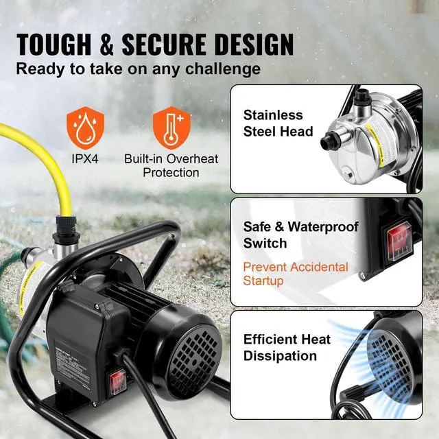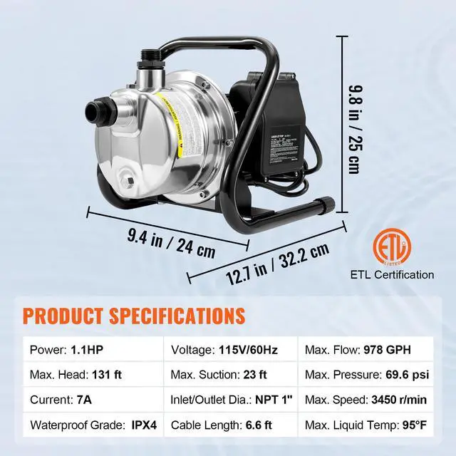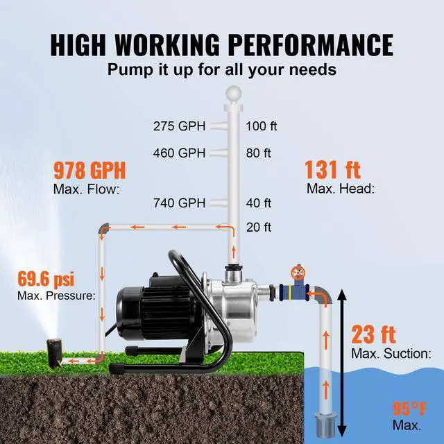 Max Pressure: 69.6 psi. This 1.1HP booster pump features a large 978 GPH flow and 131 ft head lift. No water supply problem will be a challenge for you., The thickened stainless steel pump head makes this shallow well jet pump an excellent choice, putting your mind at ease by avoiding corrosion, rust, and leakage., Whether you want to water the garden, irrigate crops, or wash your car, VEVOR is the one you can trust. This transfer pump is a great helper for sprinkler systems and lawn/farm irrigation.,