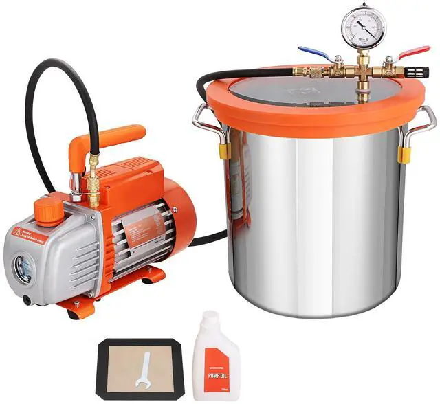 VEVOR 5 Gallon Vacuum Chamber and 3.5 CFM Pump Kit, Tempered Glass Lid Vacuum Degassing Chamber Kit, Single Stage Vacuum Pump with 250 ml Oil Bottle, for Stabilizing Wood, Degassing Silicones, Epoxies, Toughened Glass Bucket Lid, 30inHg Silicon Oil Gauge Valve, Durable Rubber Hose, Pure Copper Motor, Fast Heat Dissipation, Wide