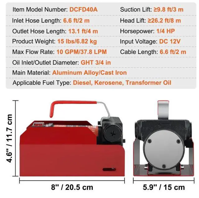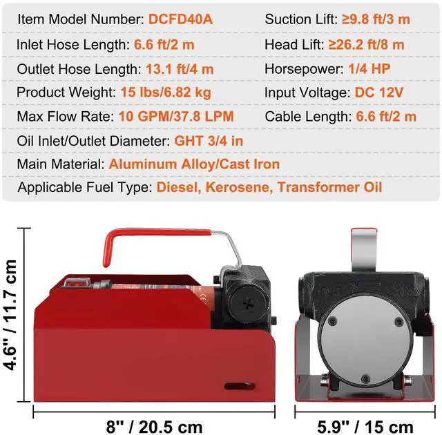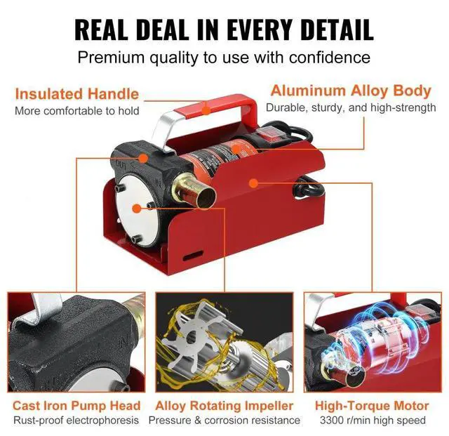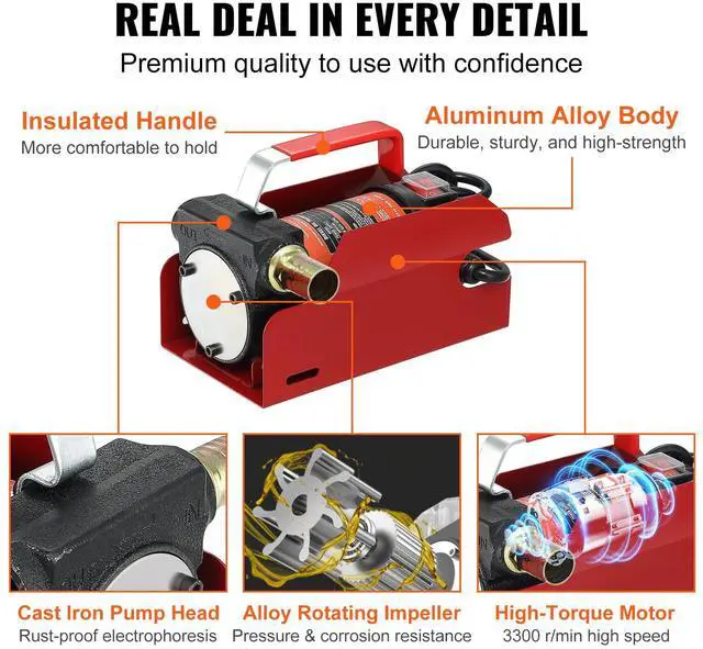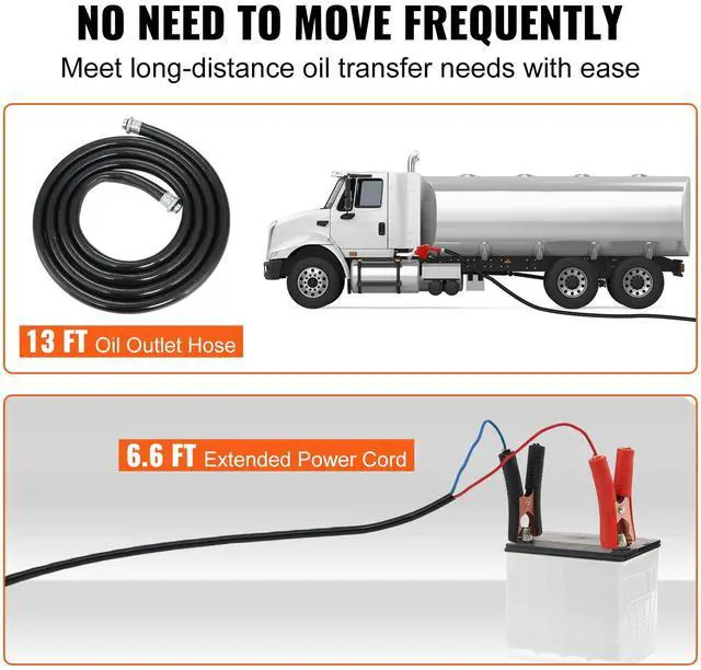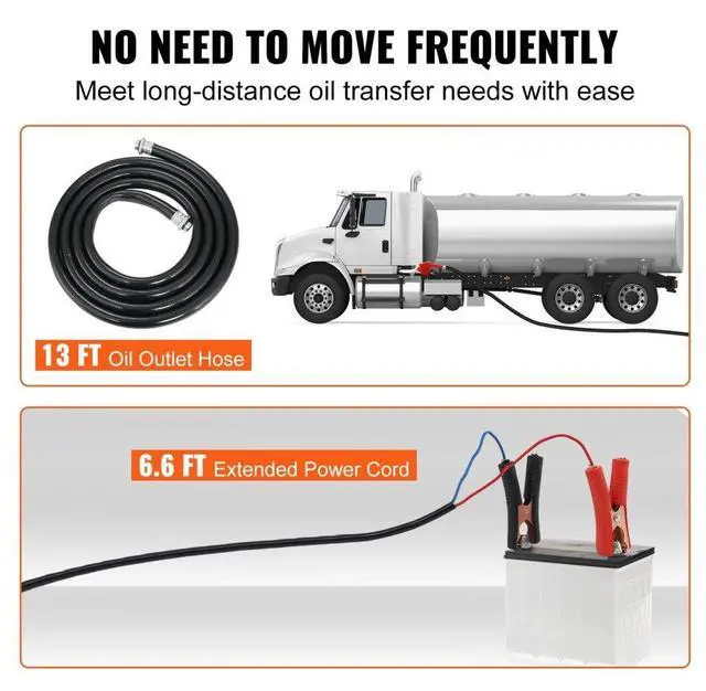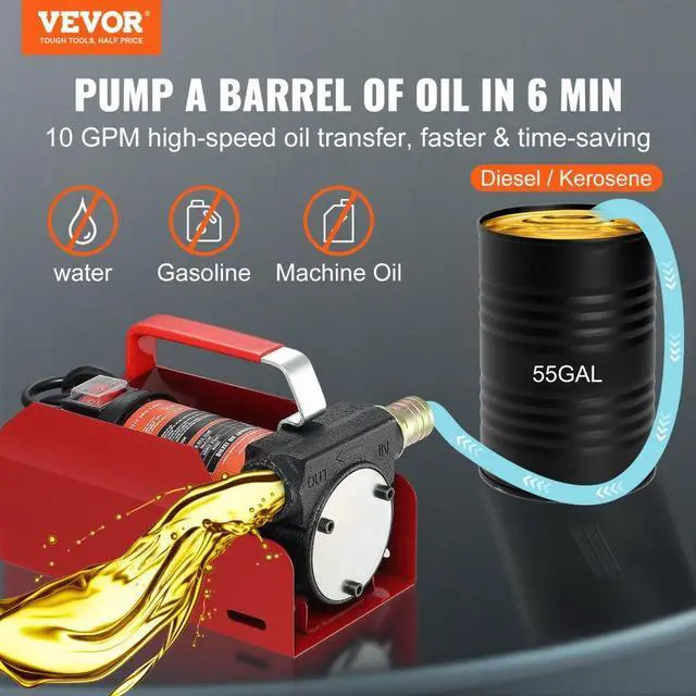 VEVOR Diesel Fuel Transfer Pump Kit, 10 GPM 12V DC Portable Electric Self-Priming Fuel Transfer Extractor Pump Kit with Automatic Shut-off Nozzle Hose for Diesel, Kerosene, Machine, Transformer Oil, With a high-speed 3300 RPM motor, the diesel pump transfers fuel at up to 10 GPM! You can fill a tractor's tank in just 43 seconds!, Our portable fuel transfer pump is equipped with a 13.1 ft extended rubber hose for large oil output without kinking. It stands up to oil and cold for durable use., This fuel transfer extractor pump has a 6.6 ft PVC inlet hose with a metal mesh filter at the end, keeping impurities out without the headache.