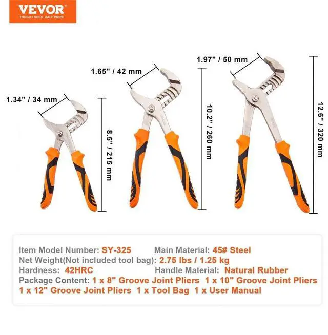 VEVOR 3-Piece Groove Joint Pliers Set, 12/10/8 inch, Heat-Treated High Carbon Steel Water Pump Pliers, Button Quick Adjustable Pliers for Home Repair, Gripping, Nuts, Bolts, Pipes, Fittings, Dual-Color TPR Handles for Superior Comfort, Precision and Versatility at Your Fingertips, Effortless Adjustability, Ultimate Toolbox Companion, Portable Tool Bag, Double Heat Treatment, Item