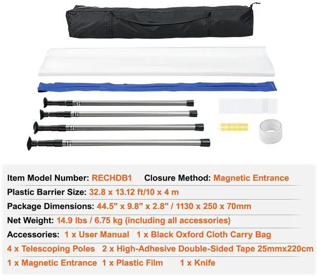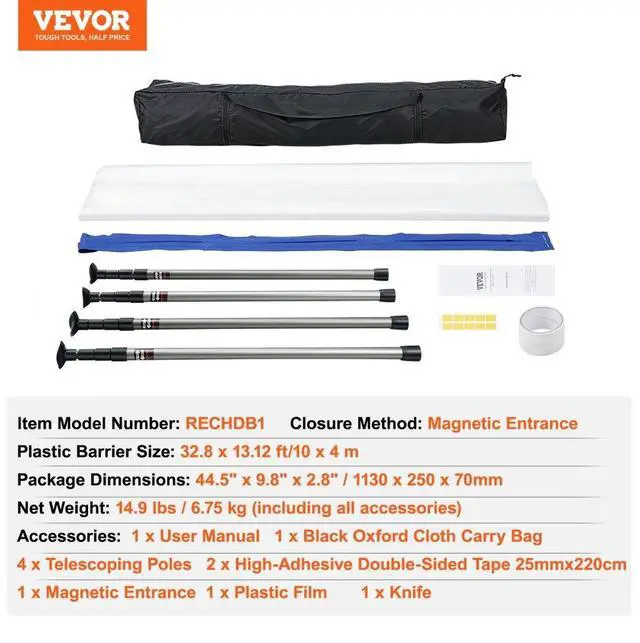 VEVOR Dust Barrier Poles, 10 Ft Barrier Poles, Dust Barrier System with 4 Telescoping Poles, Carry Bag and 32.8 x 13.12 Ft Plastic Film, for Interior Decoration, Painting, Dust-Proof Magic, Magnetic Zipper, Eco-Warrior Toughness, Adjustable Heights, Easy Installation, Portable and Easy Storage,