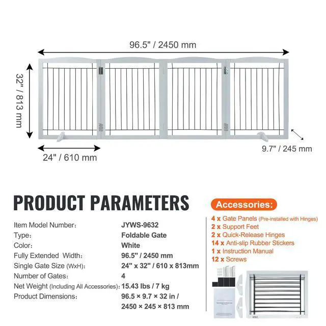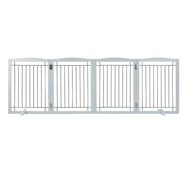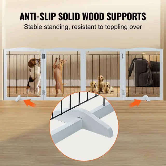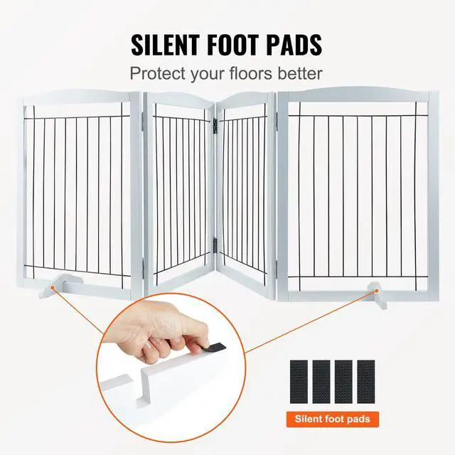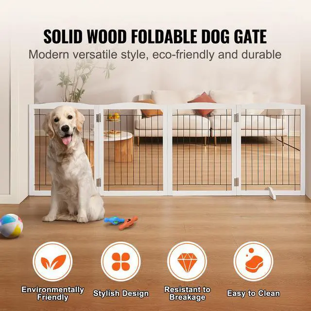 VEVOR Free Standing Dog Gate, 32" H x 96.5" W Freestanding Pet Gate, 4 Panels Foldable Dog Gate for Wide and Narrow Passageways, Expandable Dog Barrier with Silent Foot Support for Indoor, White, Modern Fashionable Design, Fits Different Widths, Sturdy and Quiet, Easy Folding, Hassle-Free Assembly, Waterproof Finish, Fully