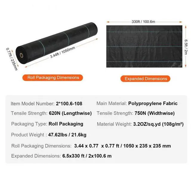 VEVOR Weed Barrier Landscape Fabric 6.5 *330FT Heavy Duty Woven Weed Control Mat, Excellent Permeability, Ultrasonic Cutting Technology, Easy Installation, Versatile Applications, Thrive Your Plants, Tear-resistant Polypropylene,