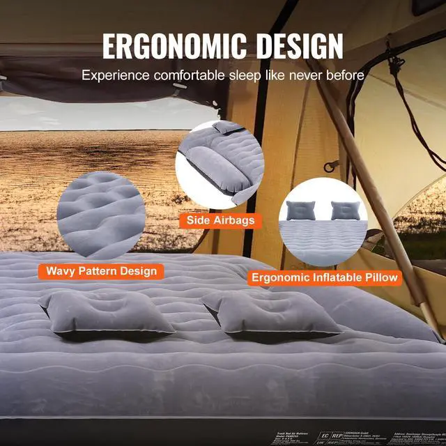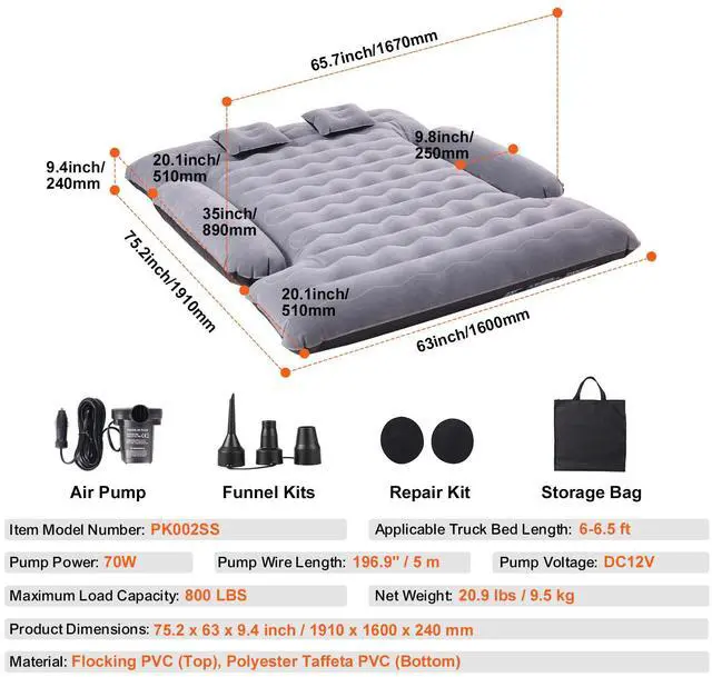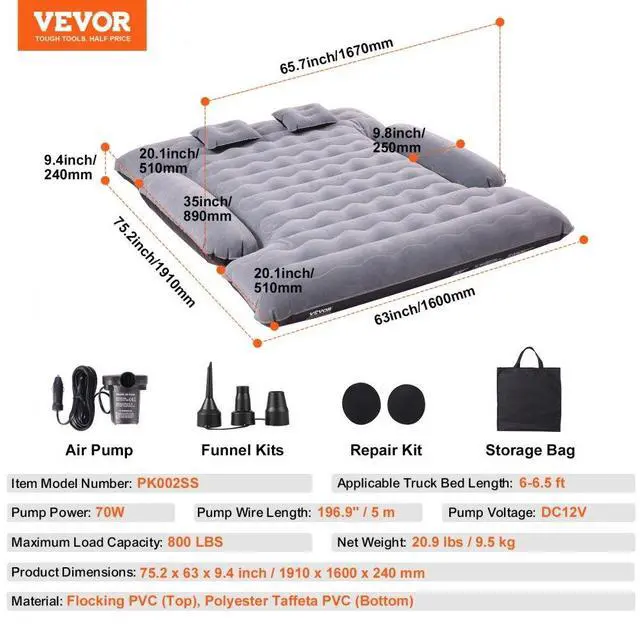 VEVOR Truck Bed Air Mattress, for 6- 6.5 ft Full Size Truck Beds, Inflatable Air Mattress Camping Bed with 12V Air Pump 2 Pillows, Carry Bag, for Chevrolet Silverado, Dodge Ram, Ford 150/250/350, Comfortable Material, Efficient 12V Air Pump, Large Load Capacity, Thoughtful Designs, Versatile Usage, Unique Pattern for Optimal Comfort, Applicable