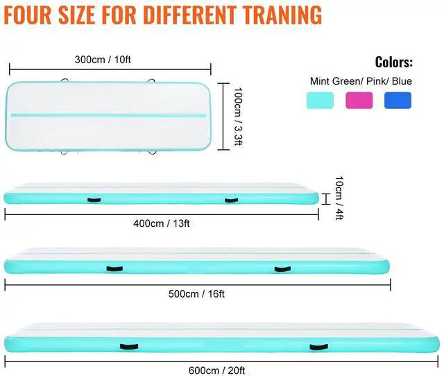 VEVOR Gymnastics Air Mat, 4 inch Thickness Inflatable Gymnastics Tumbling Mat, Tumble Track with Electric Pump, Training Mats for Home Use/Gym/Yoga/Cheerleading/Beach/Park/Water, 10 ft, Mint Green, High-Quality Inflatable Airtrack, Easy to Fold, Simple to Inflate, Exquisite Workmanship, Variety of Colors and Sizes, Versatile Applications, A Considerate Repair Kit, Color: Green, Item