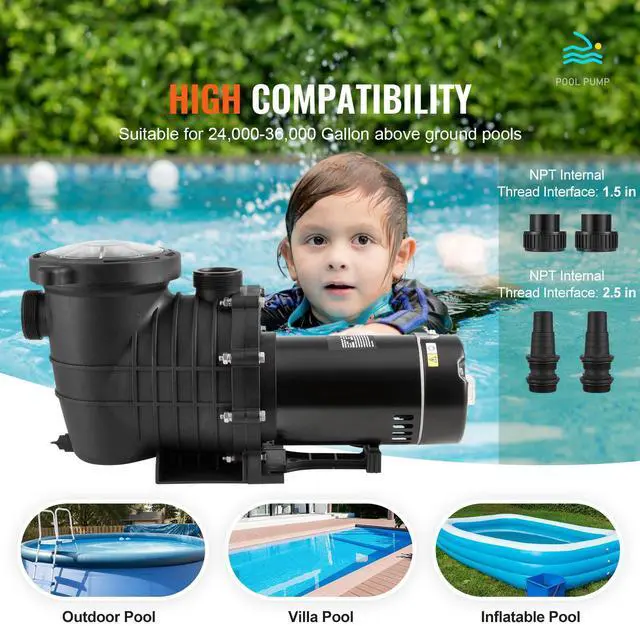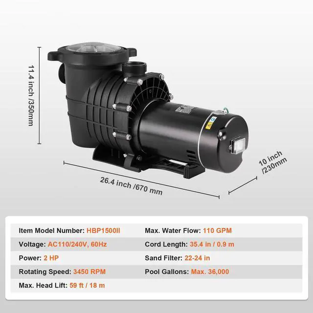 VEVOR Above Ground Pool Pump, 2 HP, 110 GPM Max Flow Single Speed Swimming Pool Pump, 110V/240V 3450 RPM 59 ft Max Head Pool Pump with Filter Basket, for Above Ground Pools Hot Tubs Spas, 2HP Single Speed Above Ground Pool Pump, Integrated Shell, For Warm Water Within 104°F, High Compatibility, Multiple Specification Options, Usage Reminder, Rotating