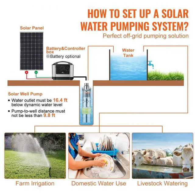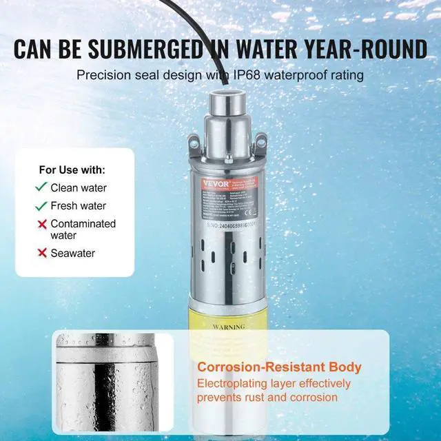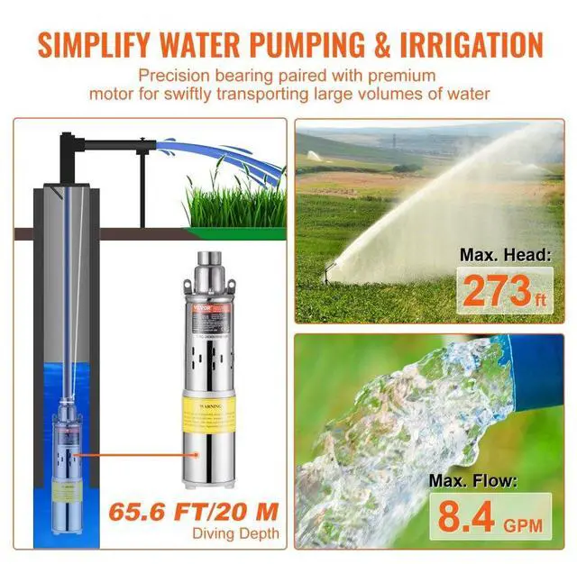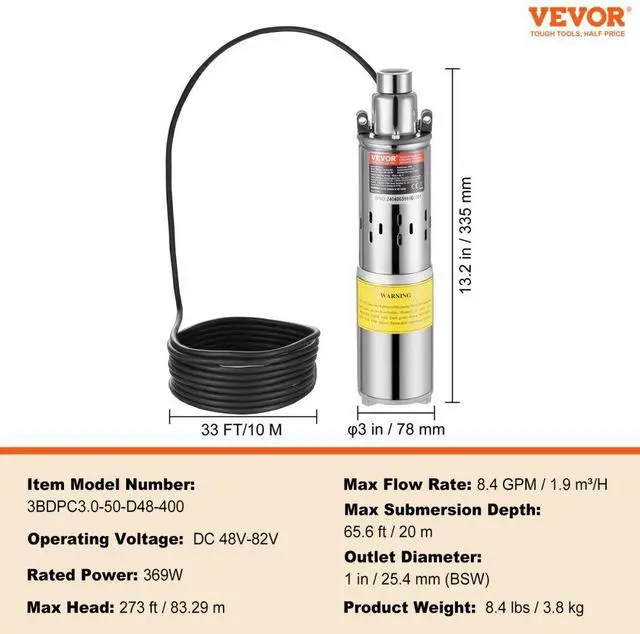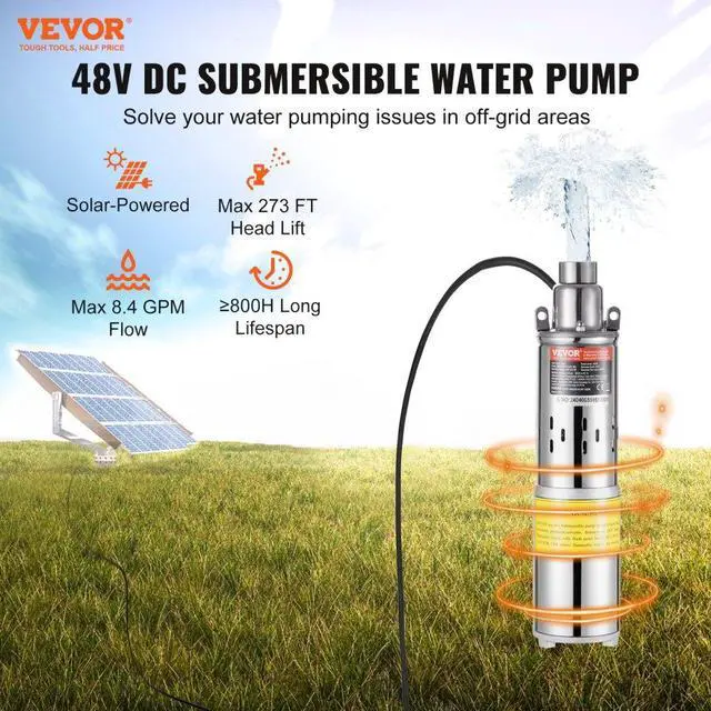 VEVOR Solar Water Pump, 48V DC 369W Submersible Deep Well Pump, Max Flow 8.4 GPM, Max Head 273 ft, Max Submersion 65.6 ft, Solar Powered Water Pump for Well, Farm Ranch Irrigation, Livestock Drinking, Energy Efficient, Filter out Impurities, Versatile Compatibility, Optimal Cord Length, Helpful Tips, Wide