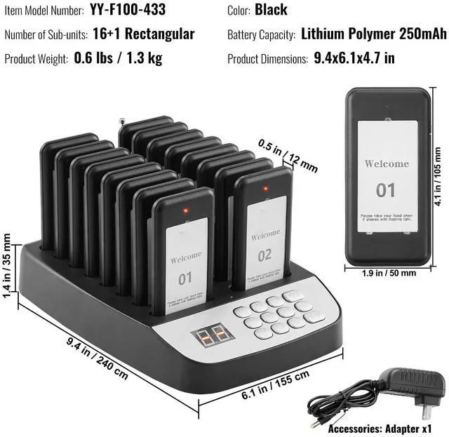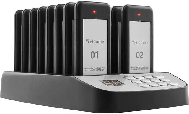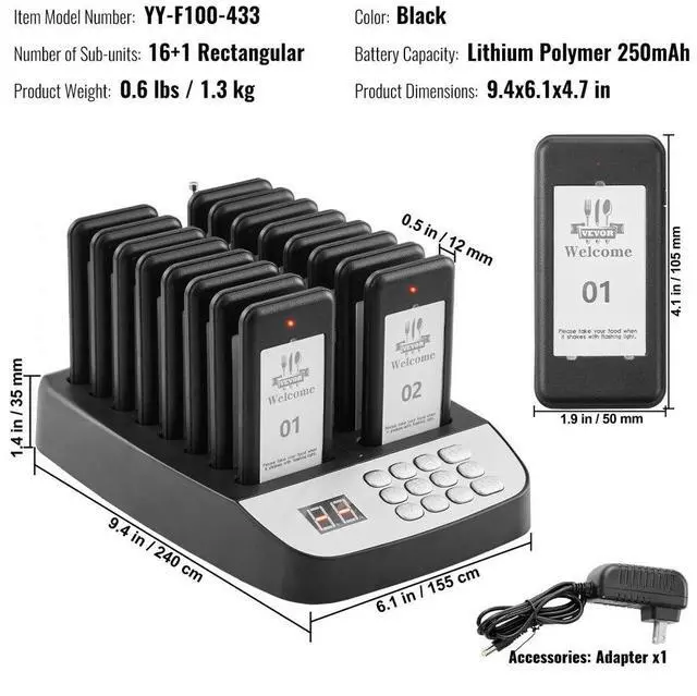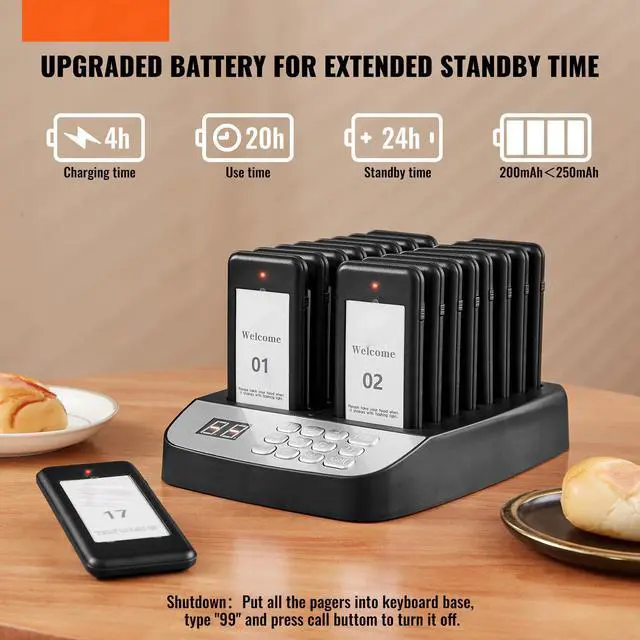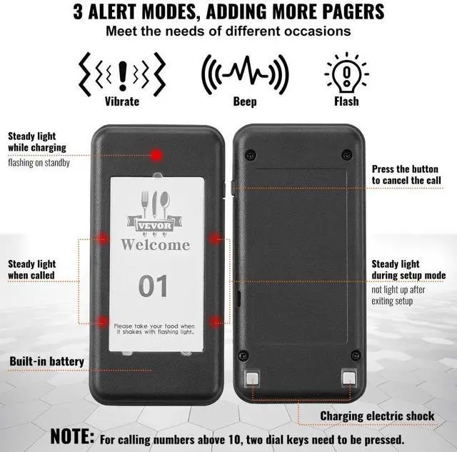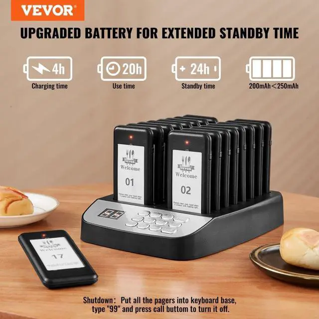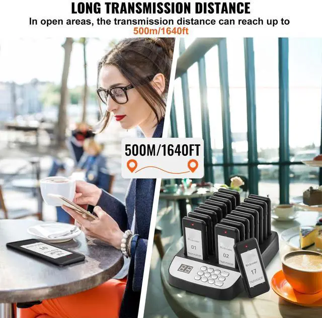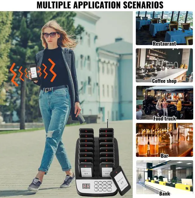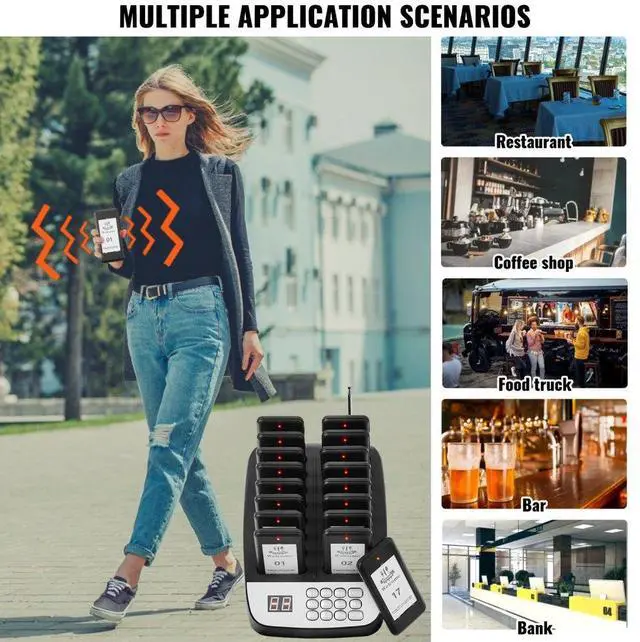 VEVOR Restaurant Pager System, Wireless 500m Long Range Lineup Waiting Queue Signal, Guest Customer Calling Beepers with Vibration & Flashing, 16 Buzzers for Food Truck, Church, Nursery, Hospital, Outstanding Performance, Long Usage Time, User-Friendly Settings, Wide Coverage, Turn On/Off, Multi-Scene