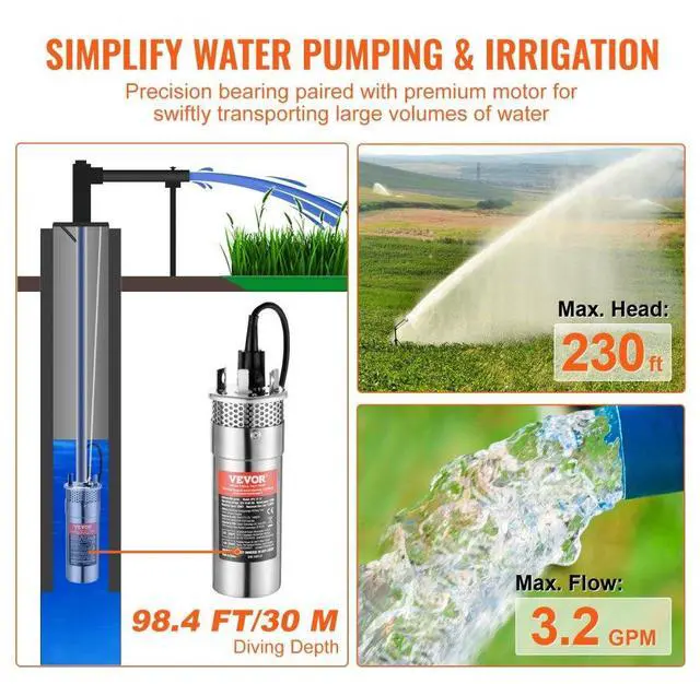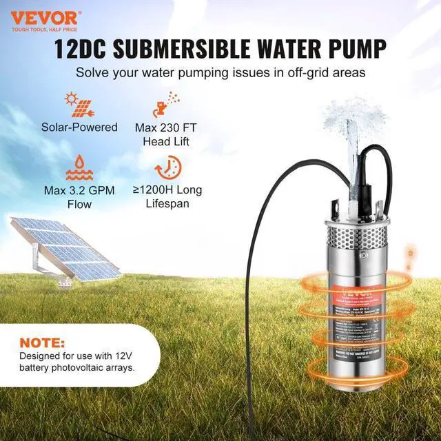 VEVOR Solar Water Pump, 12V DC 120W Submersible Deep Well Pump, Max Flow 3.2 GPM, Max Head 230 ft, Max Submersion 98.4 ft, Solar Powered Water Pump for Well, Farm Ranch Irrigation, Livestock Drinking, Energy Efficient, Filter out Impurities, Versatile Compatibility, Optimal Cord Length, Helpful Tips, Wide