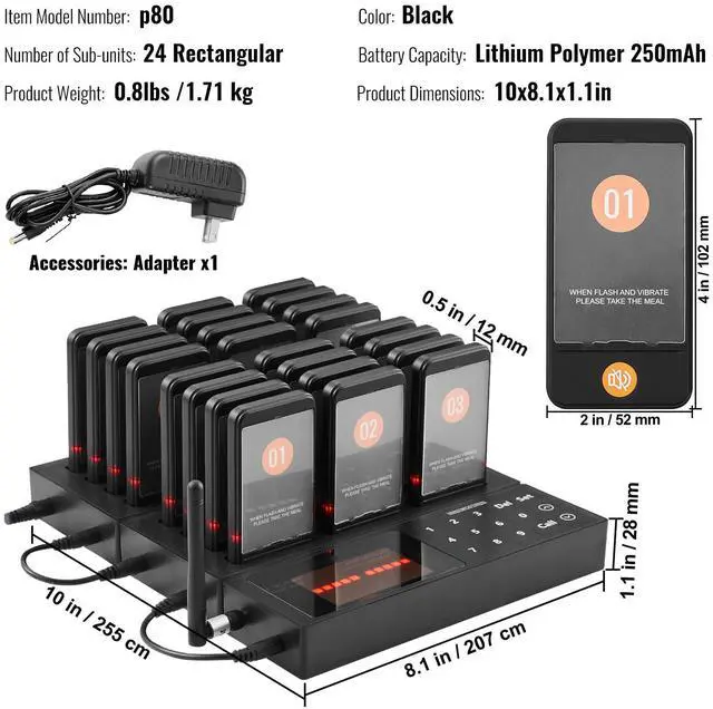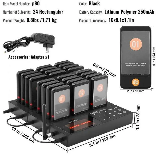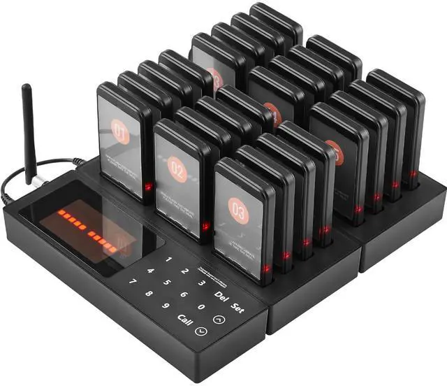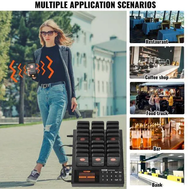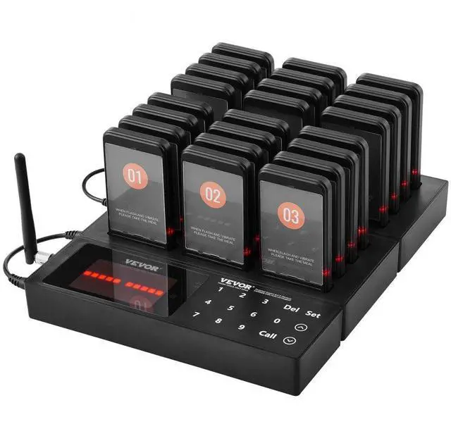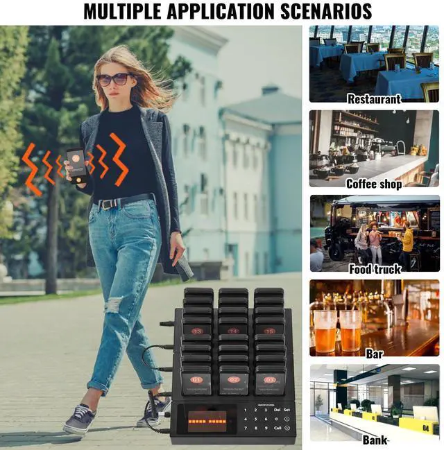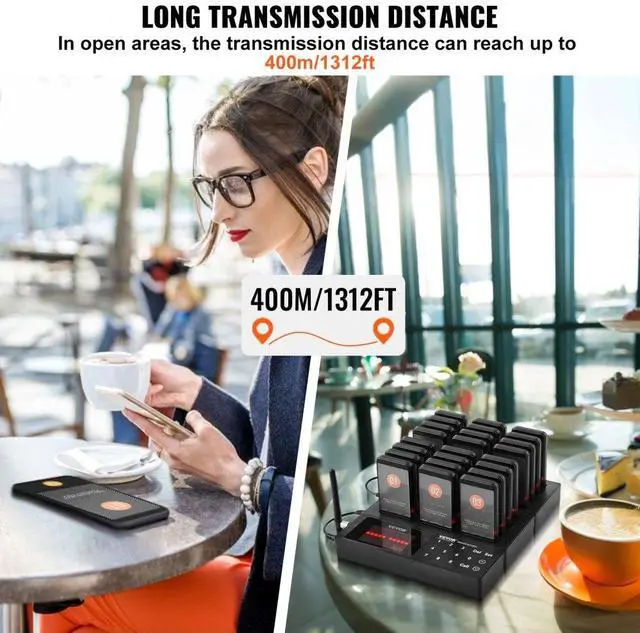 VEVOR Restaurant Pager System, Wireless 400m Long Range Lineup Waiting Queue Signal, Guest Customer Calling Beepers with Vibration & Flashing, 24 Buzzers for Food Truck, Church, Nursery, Hospital, Outstanding Performance, Long Usage Time, User-Friendly Settings, Wide Coverage, Turn On/Off, Multi-Scene