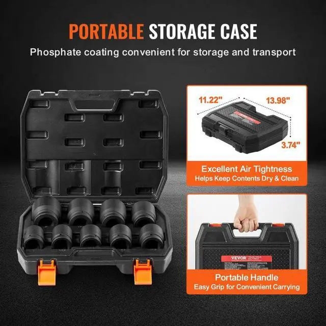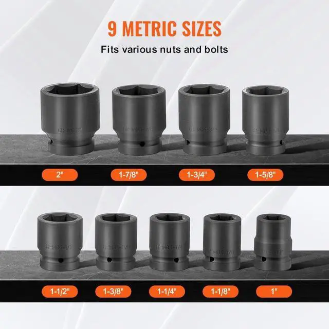 VEVOR Axle Nut Impact Socket Set 1" Drive 6-Point 9PCS SAE Spindle Nut Socket, 1 Inch Axle Nut Socket Set, 9-Piece Set, Easy Size Identification, Portable Storage Case, Suitable for Industrial and Home Repairs, 6-Point Socket Design,