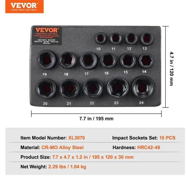 , Withstand High Torque, Distinct Size Markings, Heavy-Duty Carrying Case, Black Phosphating Treatment, Item Model Number: XL3070, Quantity: 15 PCS, Material: CR-MO Alloy Steel, Hardness: HRC42-48, Storage Box Size: 7.7 x 4.7 x 1.2 in / 195 x 120 x 30 mm, Net Weight: 2.29 lbs / 1.04 kg