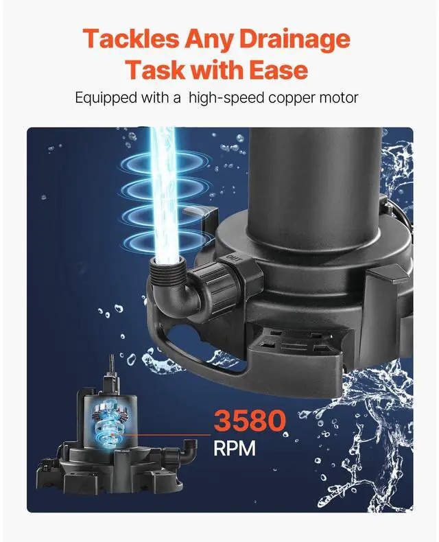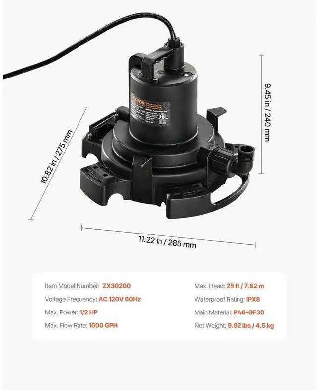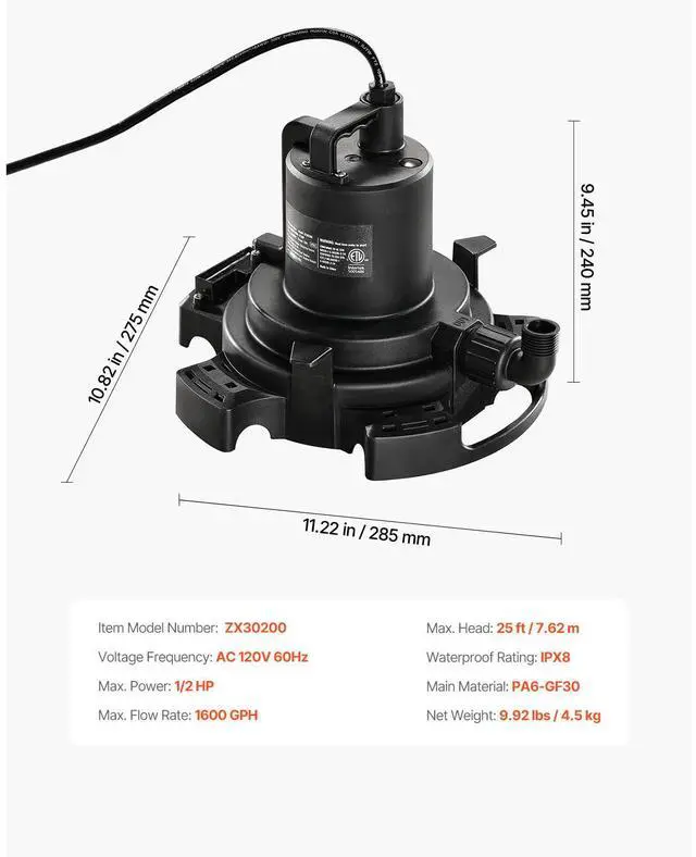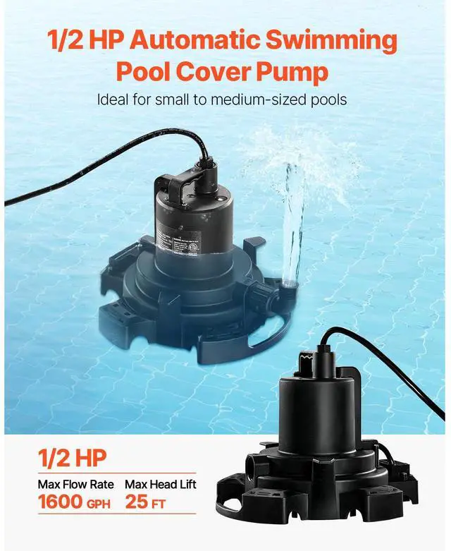 Automatic Pool Cover Pump Submersible Swimming 1/2 HP 1600 GPH 25 ft Cord, Time and Effort Saving, Longer Service Life, Secure Pump Placement, High Compatibility, Versatile Use, Enhanced Pump Performance, Max.