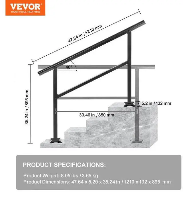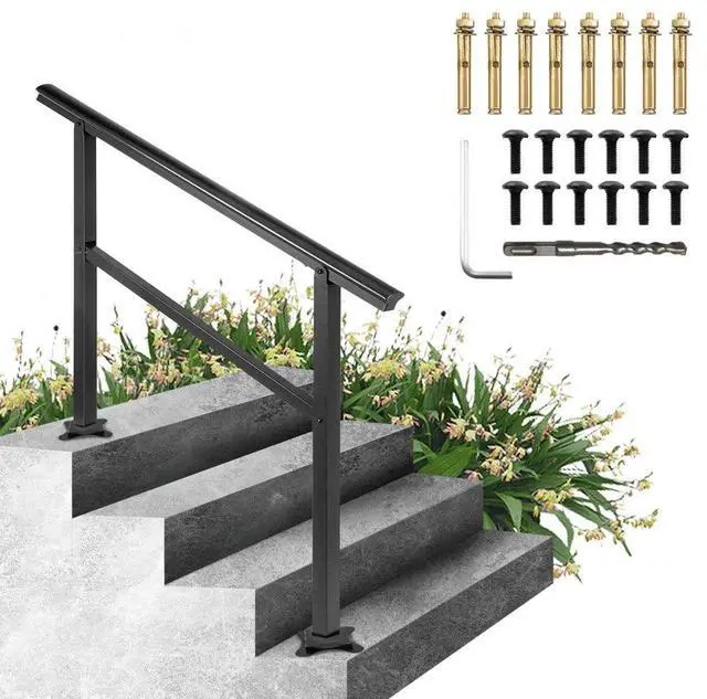 VEVOR Handrail Outdoor Stairs 47.6 X 35.2 Inch Outdoor Handrail Outdoor Stair Railing Adjustable from 0 to 30 Degrees Handrail for Stairs Outdoor Aluminum Black Stair Railing Fit 3-4 Steps